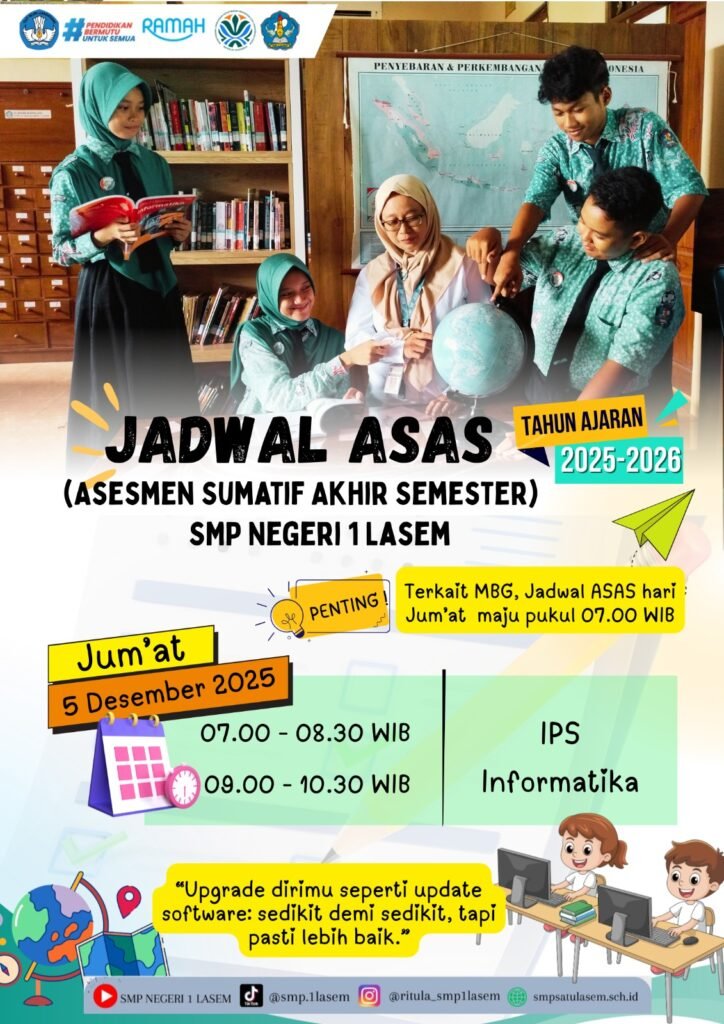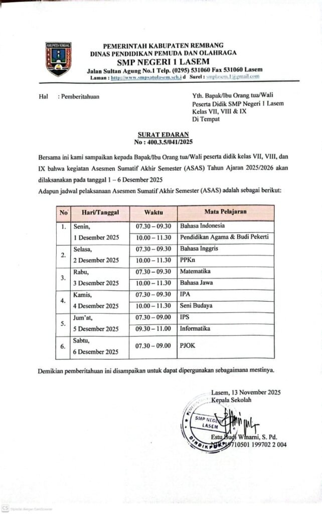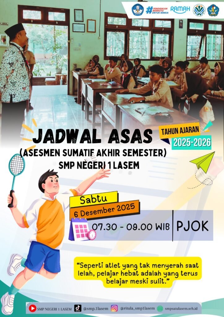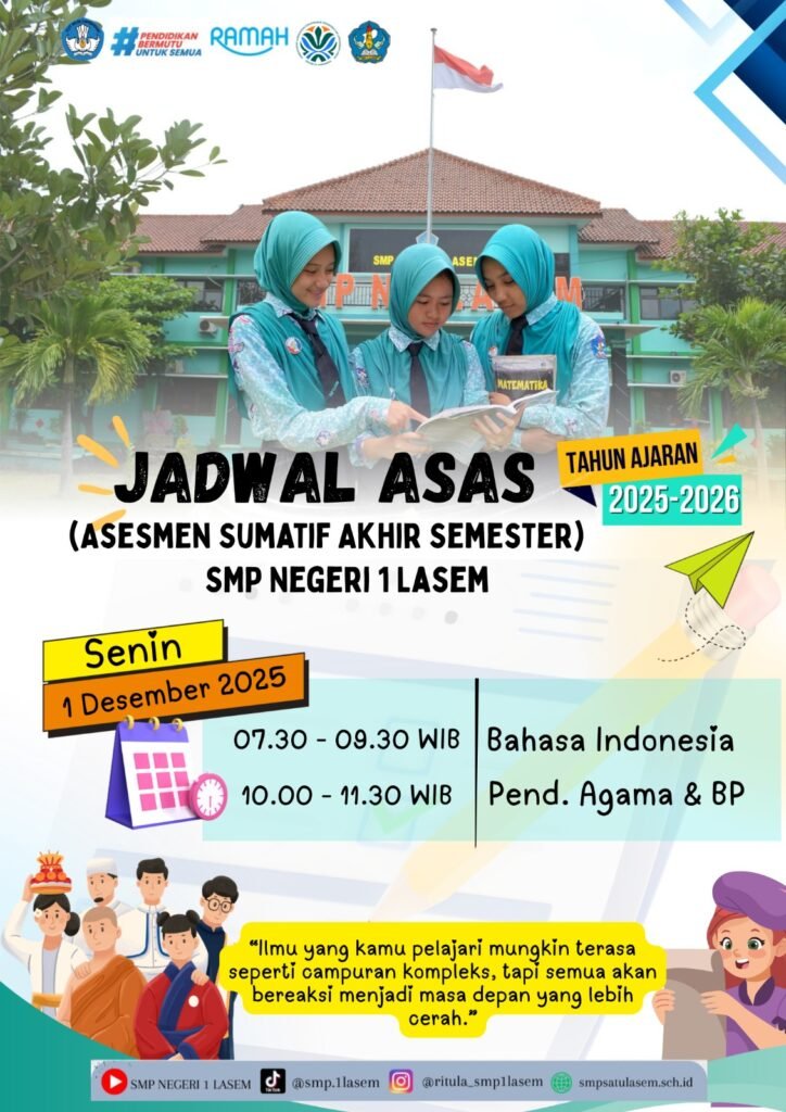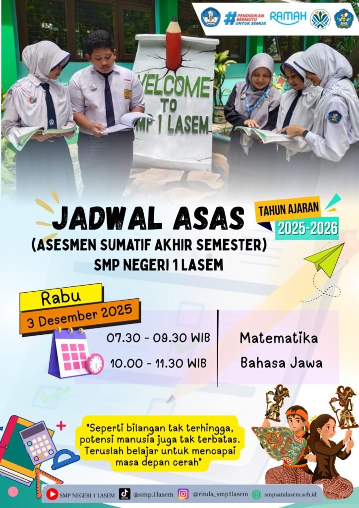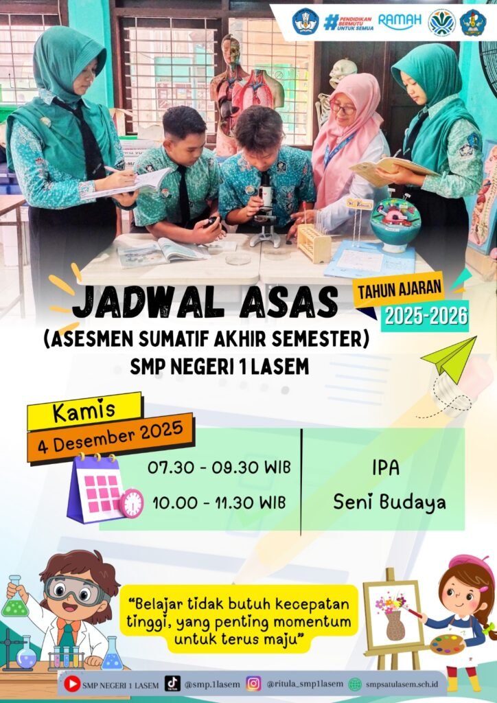 Lasem (6/12) SMP Negeri 1 Lasem telah melaksanakan kegiatan ASAS yang dimulai dari hari Senin-Sabtu tanggal 1-6 Desember 2025. Jumlah peserta ASAS kelas 7 terdiri dari 281 murid, kelas 8 berjumlah 287 murid dan kelas 9 berjumlah 283 murid. Selama pelaksanaan ASAS berlangsung dengan lancar dan tertib. Jumlah soal dan lembar jawab tidak ada kekurangan. Peserta yang tidak masuk diberikan fasilitas susulan hari Senin dan Selasa tanggal 8-9 Desember 2025.