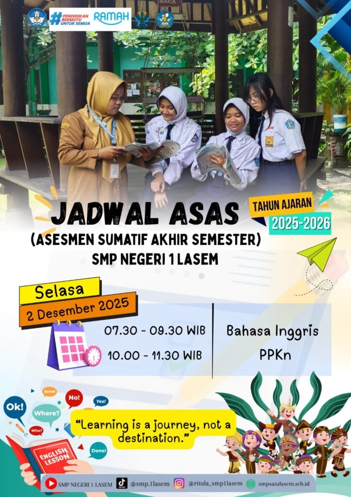 Pada hari Jum’at 5 Desember SMP Negeri 1 Lasem dikunjungi oleh Bapak Ngadiyono, S.Pd., M.Pd. sebagai Kepala Bidang SMP di kabupaten Rembang. Bapak Ngadiyono, S.Pd., M.Pd. didampingi oleh ibu kepala SMPN 1 Lasem Ibu Estu Budi Winarni, S.Pd. melakukan monitoring di salah satu kelas yang melaksakan ASAS Tahun Ajaran 2025/2026. Murid-murid diberikan pertanyaan terkait pelaksanaan ASAS yang sedang berlangsung.