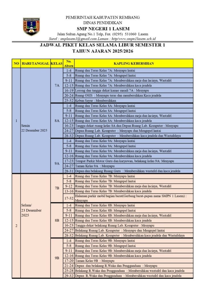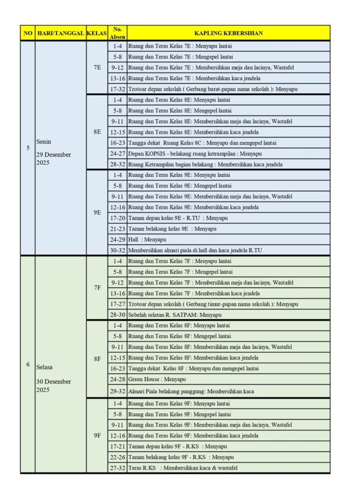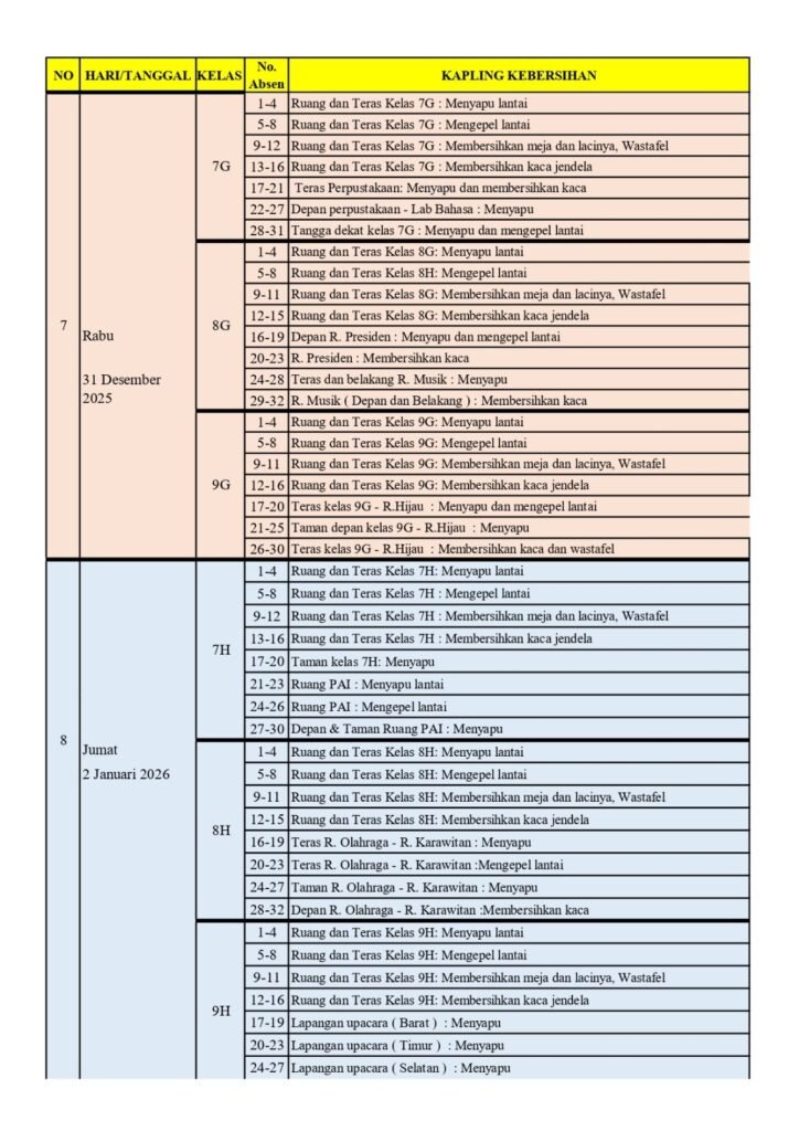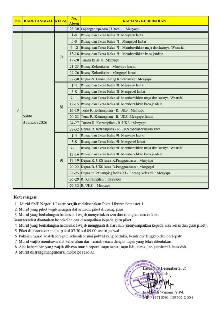 Pengumuan Piket Kebersihan Selama liburan Semester Gasal Kelas 7,8 dan 9 Tahun Ajaran 2025/2026